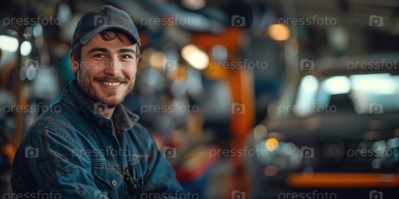 Портрет улыбающегося механика со скрещенными руками в автомастерской