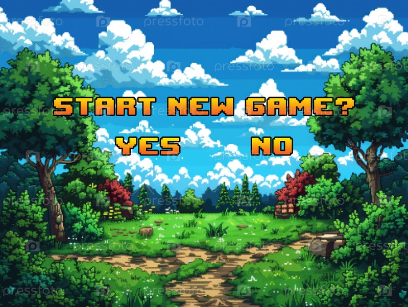 Надпись 'начать новую игру? да/нет' на фоне пикселизованного пейзажа в стиле старых 8-битных игр