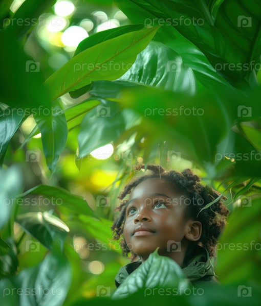 Африканская девочка среди тропической растительности, дети и природа