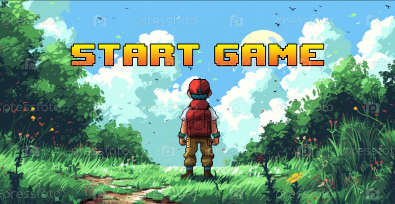 Надпись «начать игру» на пикселизированном фоне с игровым персонажем в стиле старых 8-битных игр