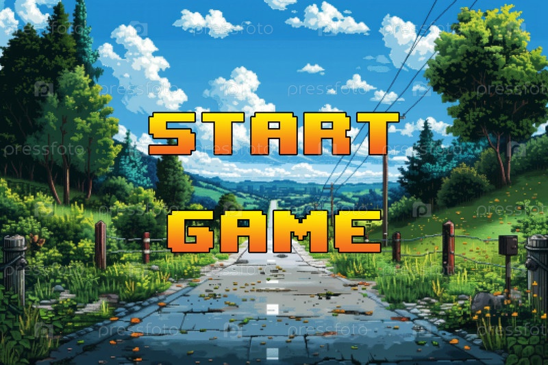 Надпись «начать игру» на пикселизированном фоне с ландшафтом и дорогой в стиле старых 8-битных игр