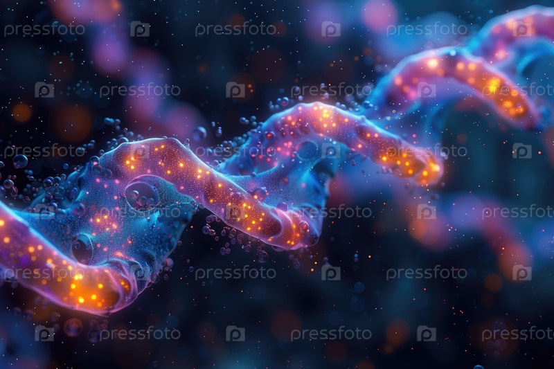 Объемная цветная иллюстрация спиральной биологической структуры в жидкости, фон на тему генетики, микробиологии, биохимии