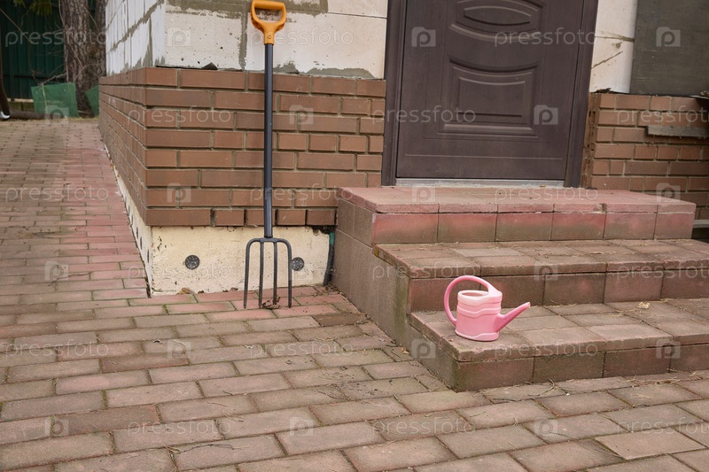 Садовый инвентарь на кирпичном патио с лейкой