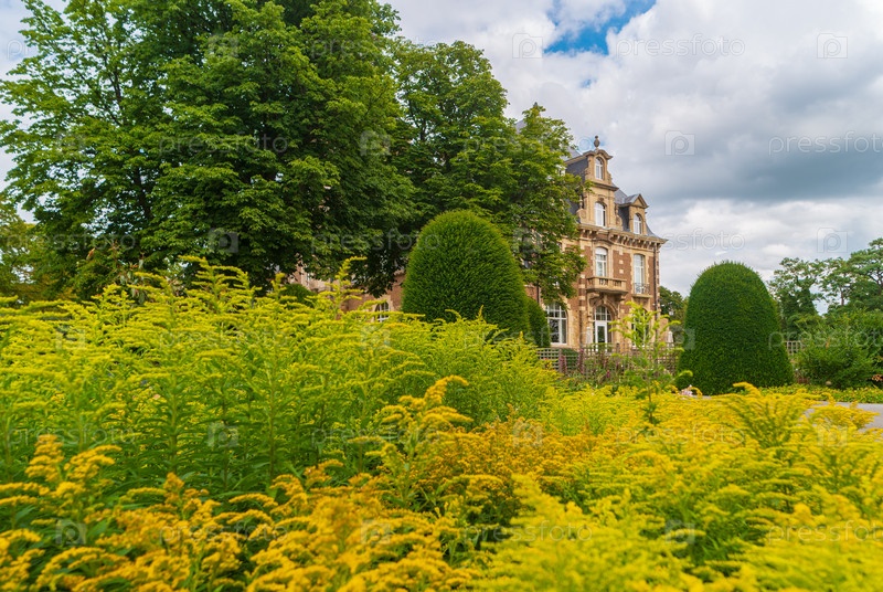 Вид на сад с замком Намюр в Бельгии. Летний пейзаж с цветами на переднем плане