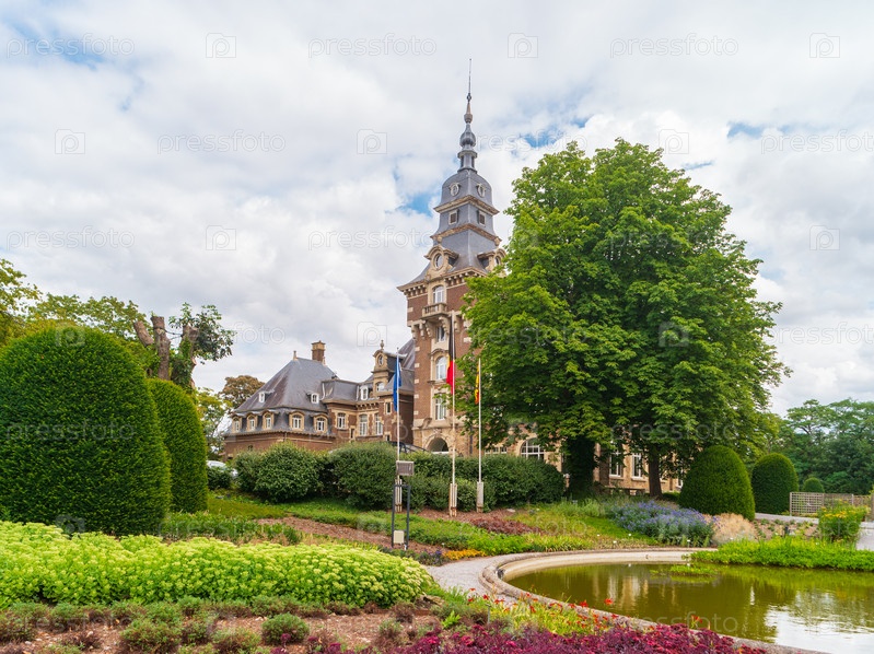 Зеленый сад с прудом на фоне замка Намюр в Бельгии. Летний пейзаж с парком