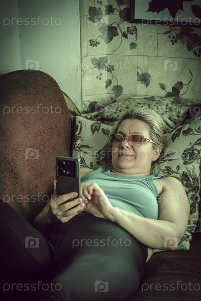Женщина лежит на диване и разговаривает по мобильному телефону