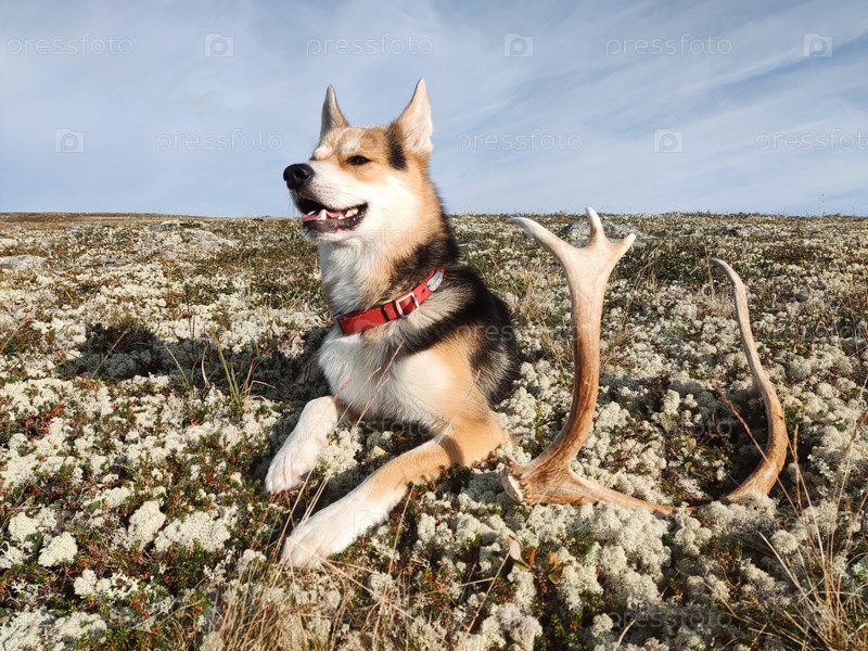 Лайка на мшистом ковре рядом с оленьими рогами