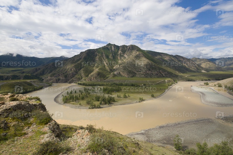 Пейзаж в горах. Алтай, долина слияние рек, голубое облачное небо