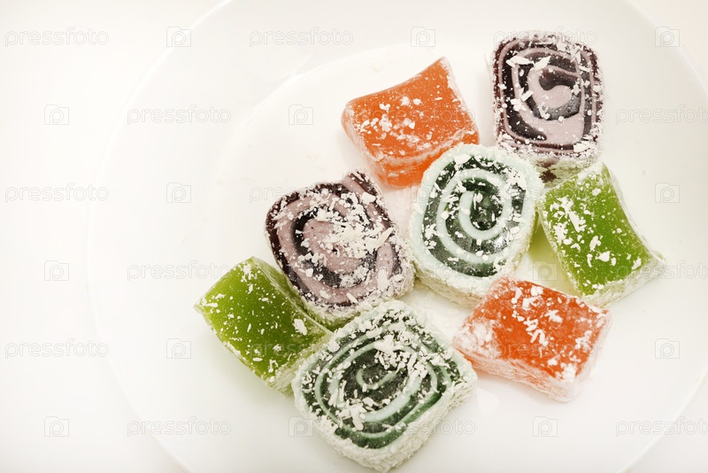 Восточная сладость. Рахат-лукум на белом фоне. Сладости крупным планом