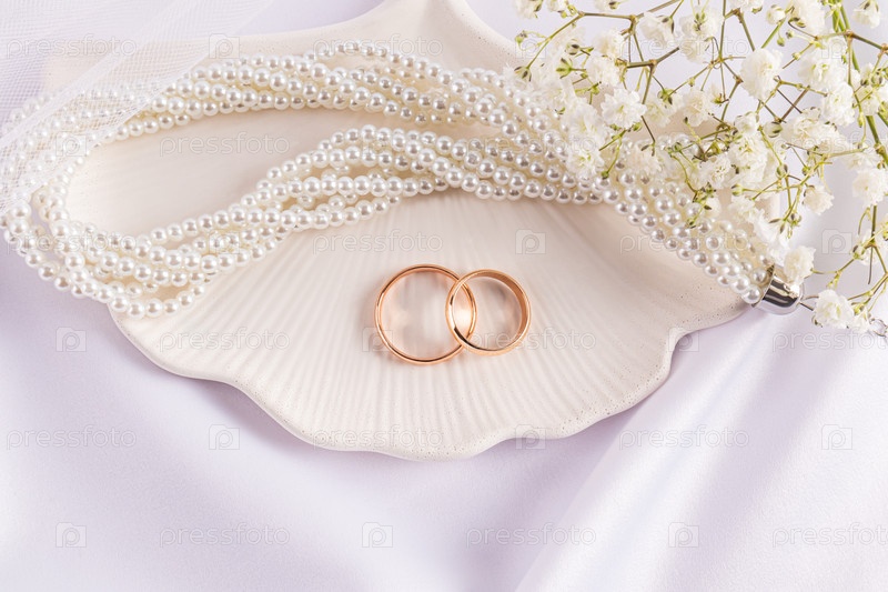 Два золотых классических обручальных кольца на декоративном шикарном подносе с жемчужным ожерельем и белыми цветами гипсофилы. Нежная свадебная открытка. макет