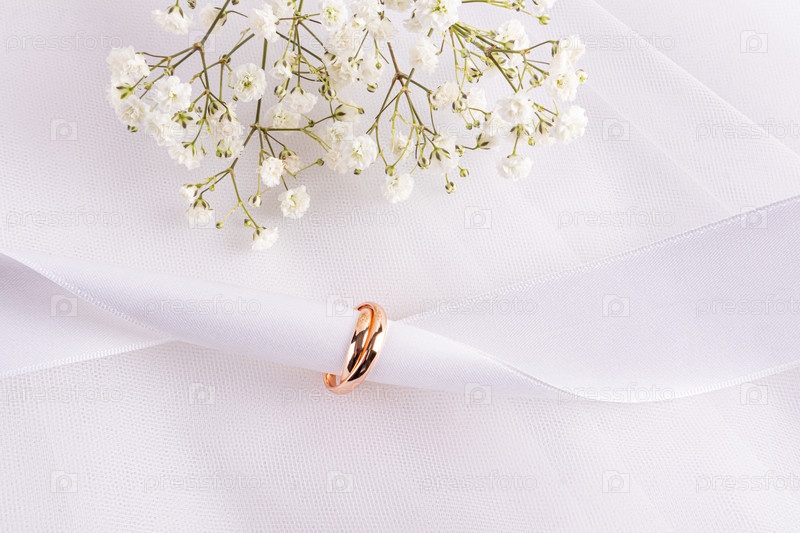 Два золотых обручальных кольца надеты на белую атласную ленту на белом фоне шикарной ткани с цветами. Концепция свадебной открытки, приглашения