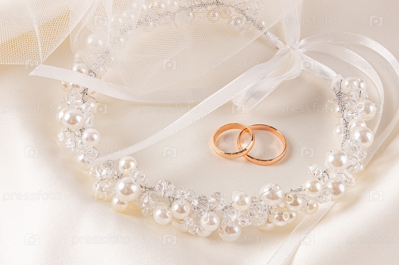 Два золотых обручальных кольца лежат на бежевом атласном фоне с шикарным украшением в прическе невесты жемчужным венком с лентой. открытка