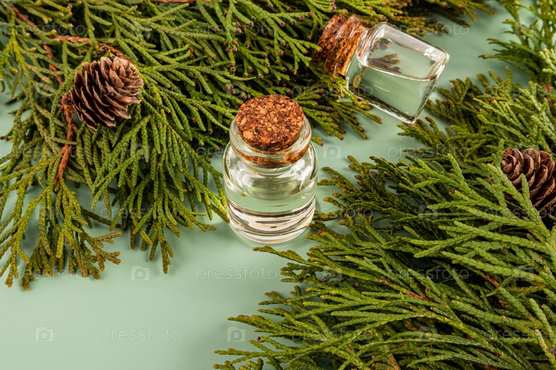 Две стеклянные бутылки натурального хвойного масла для ухода за собой на зеленом фоне среди густых ветвей туи. Массаж, ароматерапия на дому