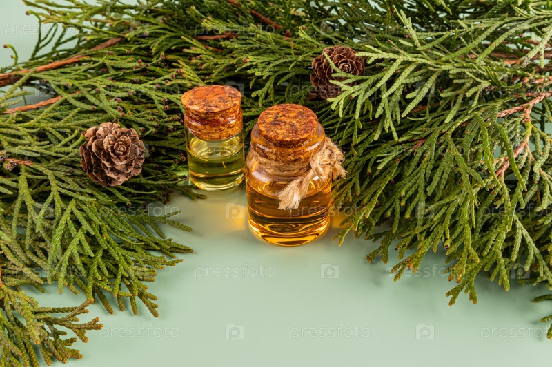 Две стеклянные бутылки с пробковой крышкой с натуральным хвойным маслом среди зеленых ветвей туи. Концепция натурального, органического ухода в домашних условиях
