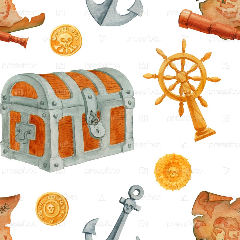 В поисках сокровищ. Акварельный мультяшный принт с пиратским сундуком, старой картой сокровищ и монетами на белом фоне. Креативный дизайн для детских тканей, упаковки, текстиля, обоев, одежды.In search of treasure. Watercolor cartoon print with pirate che
