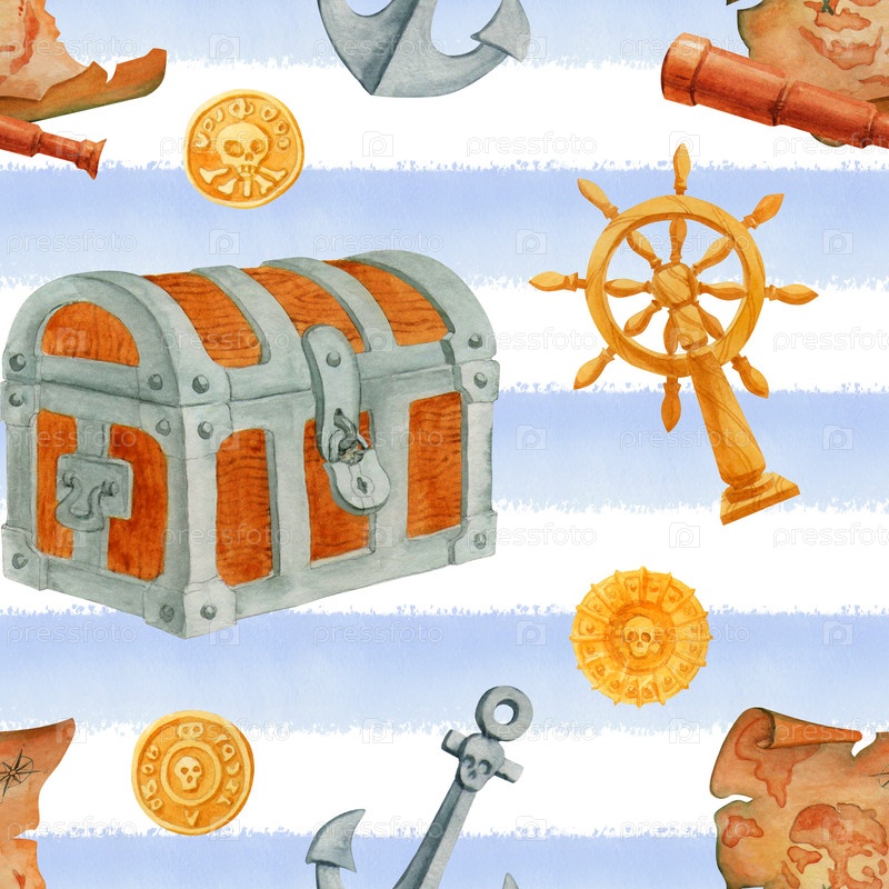 Акварельный бесшовный узор с сундуком, картой и монетами на сине-белом полосатом фоне. Тема пиратов и поиска сокровищ для дизайна детских тканей, упаковки, текстиля, обоев и одежды. Watercolor seamless pattern with chest, map and coins on blue and white s