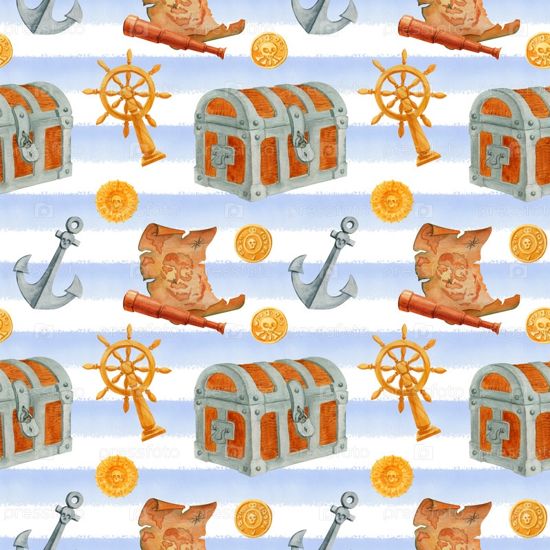 Акварельный бесшовный узор с сундуком, картой и монетами на сине-белом полосатом фоне. Тема пиратов и поиска сокровищ для дизайна детских тканей, упаковки, текстиля, обоев и одежды. Watercolor seamless pattern with chest, map and coins on blue and white s