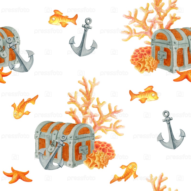 Затонувшие пиратские сокровища. Закрытые старые сундуки на дне океана среди рыб, якорей и кораллов. Простой акварельный бесшовный узор на белом фоне для детского текстиля или обоев в морском стиле. Sunken pirate treasure. Closed old chests on the ocean fl