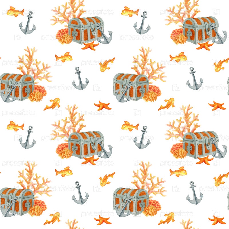 Затонувшие пиратские сокровища. Закрытые старые сундуки на дне океана среди рыб, якорей и кораллов. Простой акварельный бесшовный узор на белом фоне для детского текстиля или обоев в морском стиле. Sunken pirate treasure. Closed old chests on the ocean fl