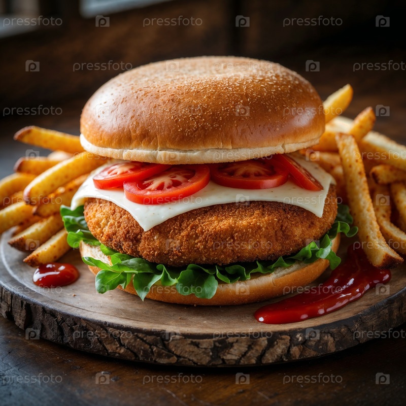 Шаткий хрустящий сэндвич с растопленной моцареллой и золотистым картофелем фри, гурманским фастфудом на деревянной доске