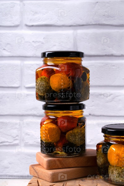 Сырные шарики из йогурта Лабне в специях в стеклянных банках на белом фоне. Блюдо ближневосточной кухни