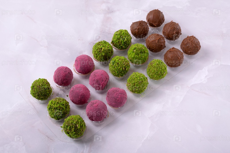 Три вида шоколадных конфет в молочном шоколаде, с посыпкой из молотых фисташек и порошка питахайи на светлом фоне. Десерт для праздника. Ручная работа. Вид сверху
