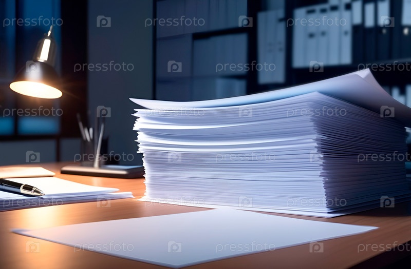 Большая стопка бумаг на офисном столе под лампой в тускло освещенном рабочем пространстве. Ночная занятость
