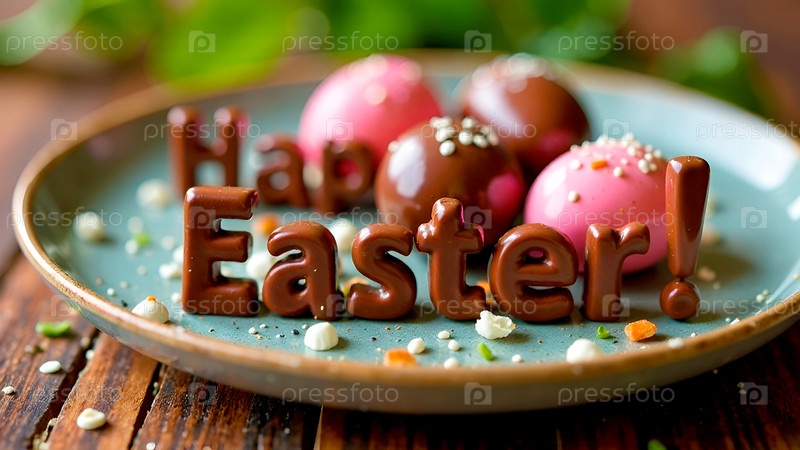 Счастливой Пасхи шоколадные надписи, яйца на тарелке и весенняя зелень. Приглашение в кафе, кондитерские