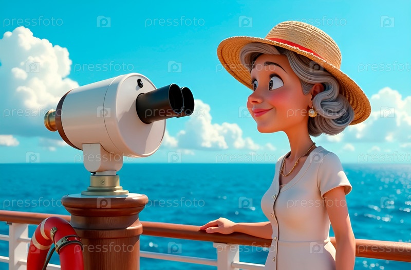 Пожилая седая женщина в шляпе на корабле смотрит в бинокль. Мультяшный стиль