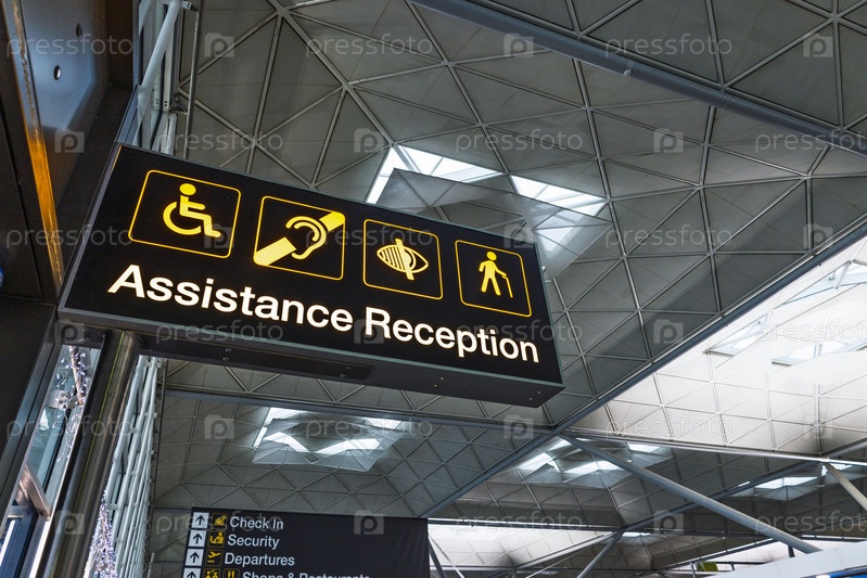 Знак стойки приема помощи в аэропорту, направляющий пассажиров к службам поддержки и помощи по обеспечению доступности
