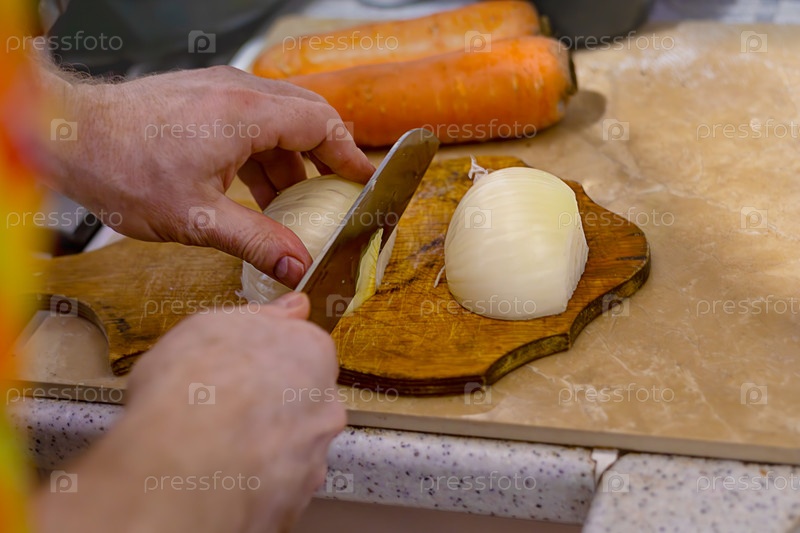 Мужские руки режут лук на деревянной доске на кухне. Готовим из свежих овощей. Здоровое питание. Крупный план