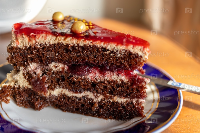 Кусок многослойного шоколадного торта, покрытый блестящей вишневой глазурью и золотыми украшениями, на тарелке