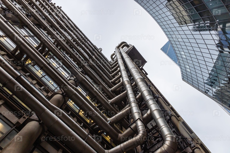 Снимок современных небоскребов в Лондоне с нижнего ракурса, демонстрирующий архитектуру в индустриальном стиле и футуристический дизайн