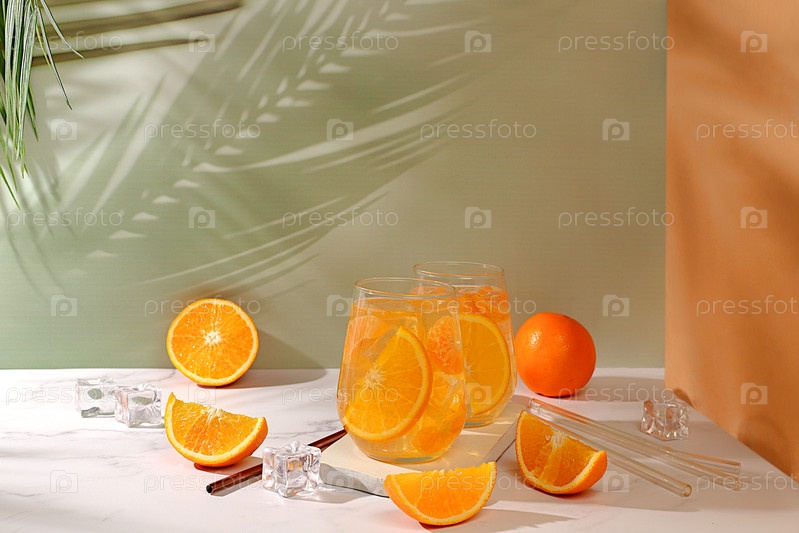 Современный натюрморт с цитрусовыми, апельсиновым соком и апельсинами на элегантном кухонном столе с длинными жесткими тенями. Концепция минимальной детокс-диеты, летние витаминные напитки, селективный фокус, место для текста