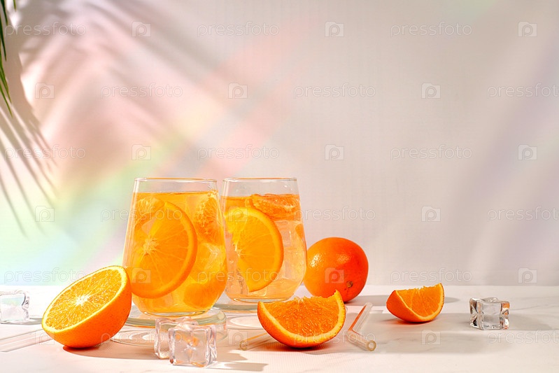 Современный натюрморт с цитрусовыми, апельсиновым соком и апельсинами на элегантном кухонном столе с длинными жесткими тенями. Концепция минимальной детокс-диеты, летние витаминные напитки, селективный фокус, место для текста