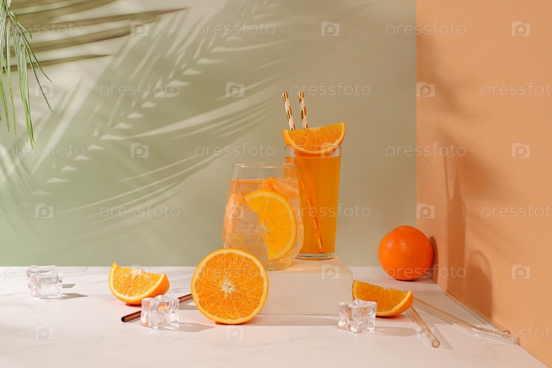 Апельсиновый сок и апельсины на элегантном кухонном столе с длинными жесткими тенями. Современный натюрморт с цитрусовыми, концепция минимальной детокс-диеты, летние витаминные напитки, селективный фокус, место для текста