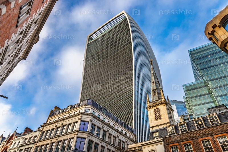 Знаменитое здание Walkie Talkie на Фенчерч-стрит, 20, в окружении исторических и современных лондонских построек