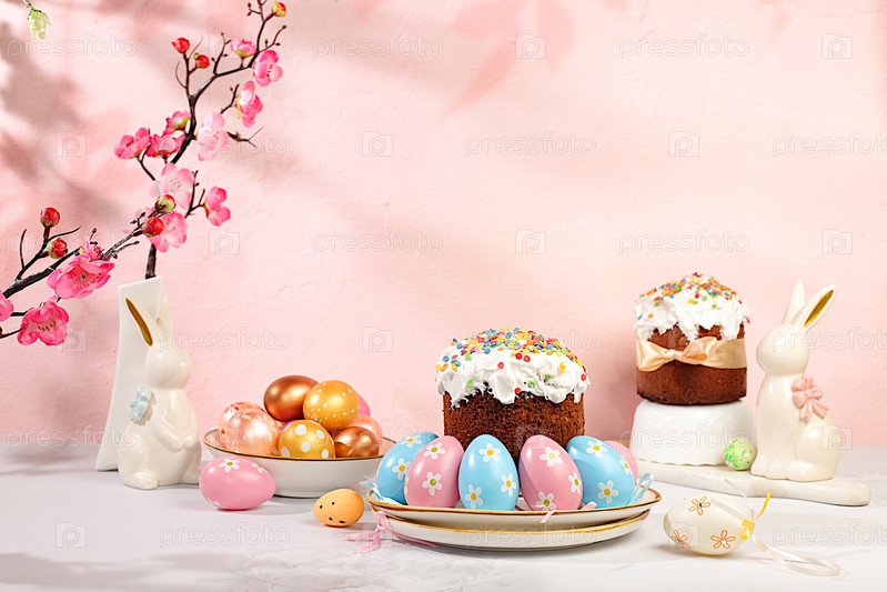 Традиционный пасхальный кулич и мраморные пасхальные яйца, расписанные золотой куркумой, и чай из гибискуса с ветками сакуры, концепция празднования Пасхи, идеи пасхальных блюд для домашней кухни