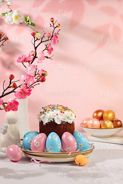 Традиционный пасхальный кулич и мраморные пасхальные яйца, расписанные золотой куркумой, и чай из гибискуса с ветками сакуры, концепция празднования Пасхи, идеи пасхальных блюд для домашней кухни