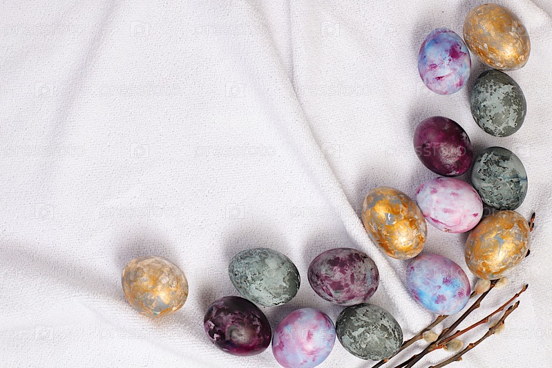 Мраморные пасхальные яйца, расписанные золотой куркумой и чаем из гибискуса с ветками сакуры на светлом полотенце, концепция празднования Пасхи, идеи пасхальных блюд для домашней кухни