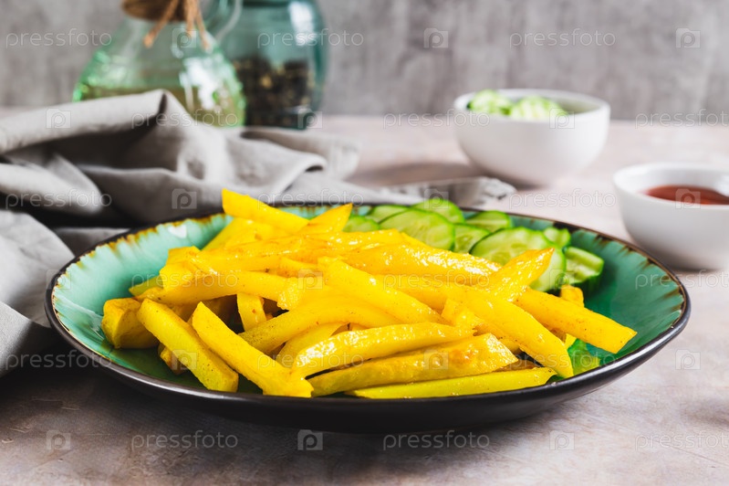 Аппетитный картофель фри и ломтики огурца на тарелке на столе