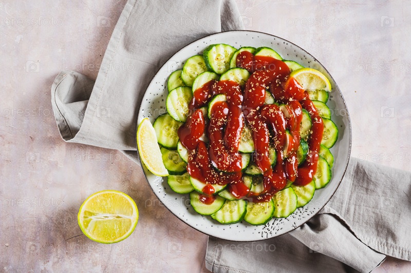 Крупный план мексиканских острых огурцов с соусом чили и лаймом на тарелке на столешнице