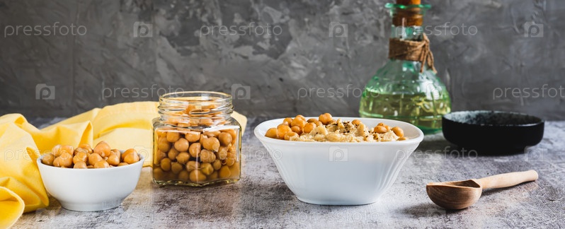 Домашний хумус с нутом в миске на столе веб-баннер