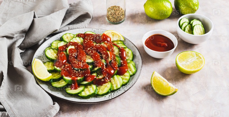 Мексиканские острые огурцы с соусом чили и лаймом на тарелке на столе веб-баннер