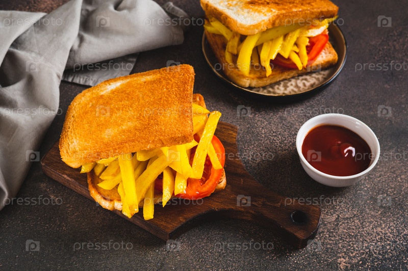 Хрустящий сэндвич с картофелем фри и помидорами на доске на столе