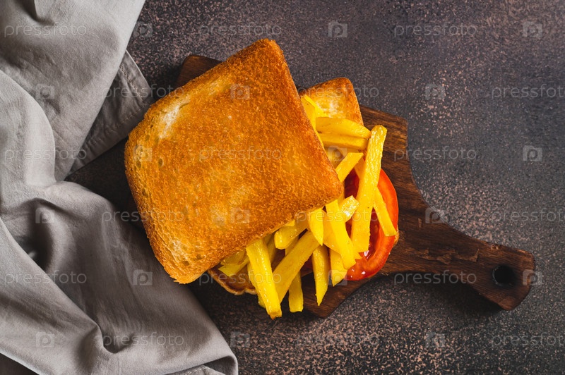 Крупный план жареных тостов с картофелем фри и помидорами на доске на столешнице