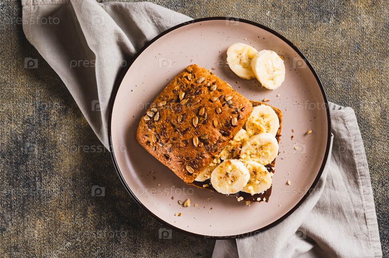 Крупный план сладкого сэндвича с шоколадным маслом, бананом и орехами на тарелке, вид сверху