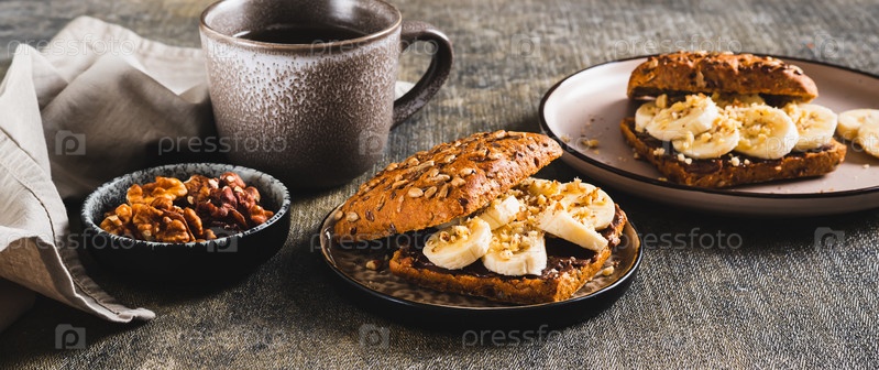 Сладкий сэндвич с шоколадным маслом, бананом и орехами на тарелке на столе веб-баннер