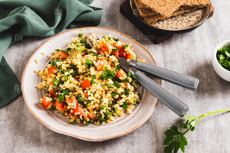 Традиционный вегетарианский салат табуле на тарелке на столе