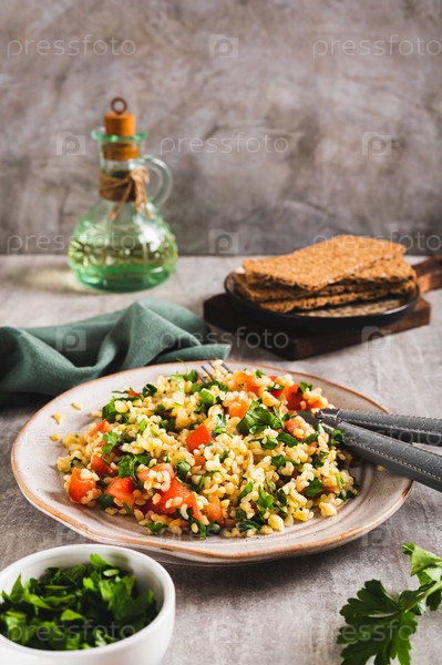 Салат Табуле с булгуром, помидорами и петрушкой на тарелке на столе вертикальный вид